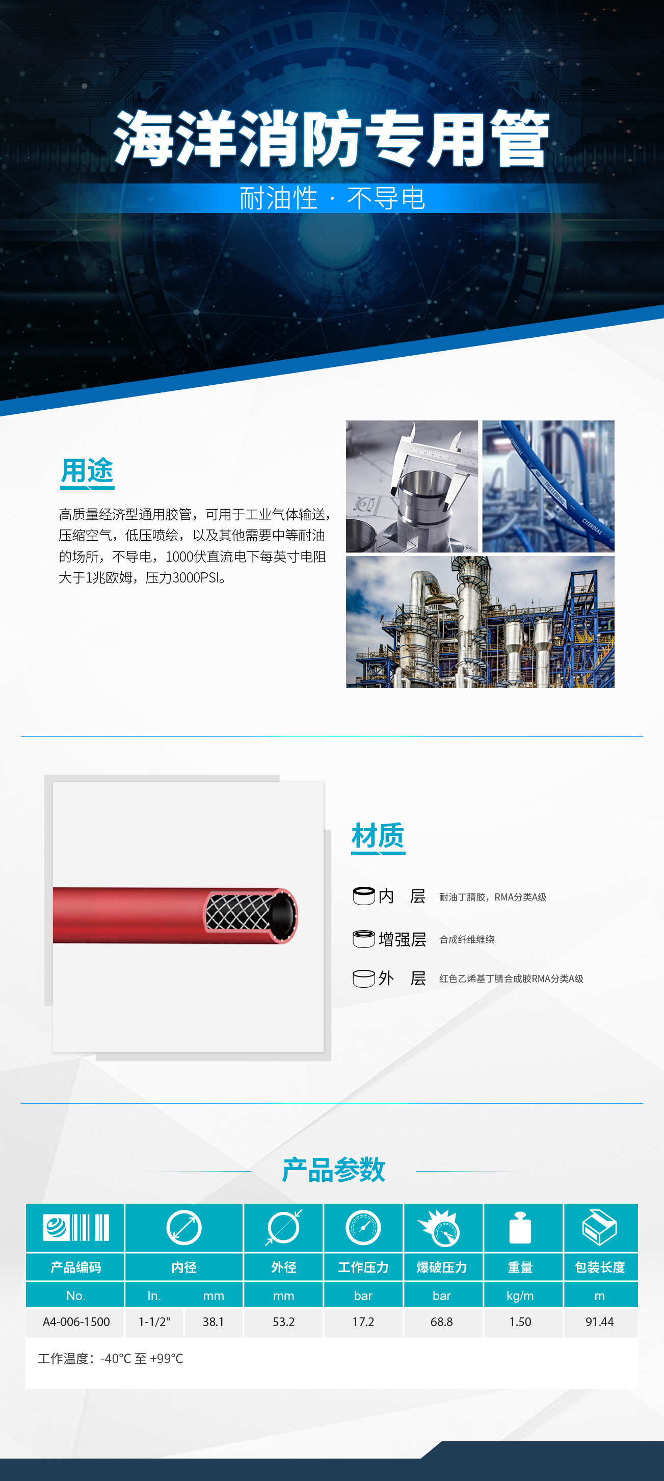 高質(zhì)量經(jīng)濟(jì)的通用膠管,可用于工業(yè)氣體輸送,壓縮空氣,低壓噴繪,以及其它需要中等耐油的場所,不導(dǎo)電,1000伏直流電下每英寸電阻大于1兆歐姆