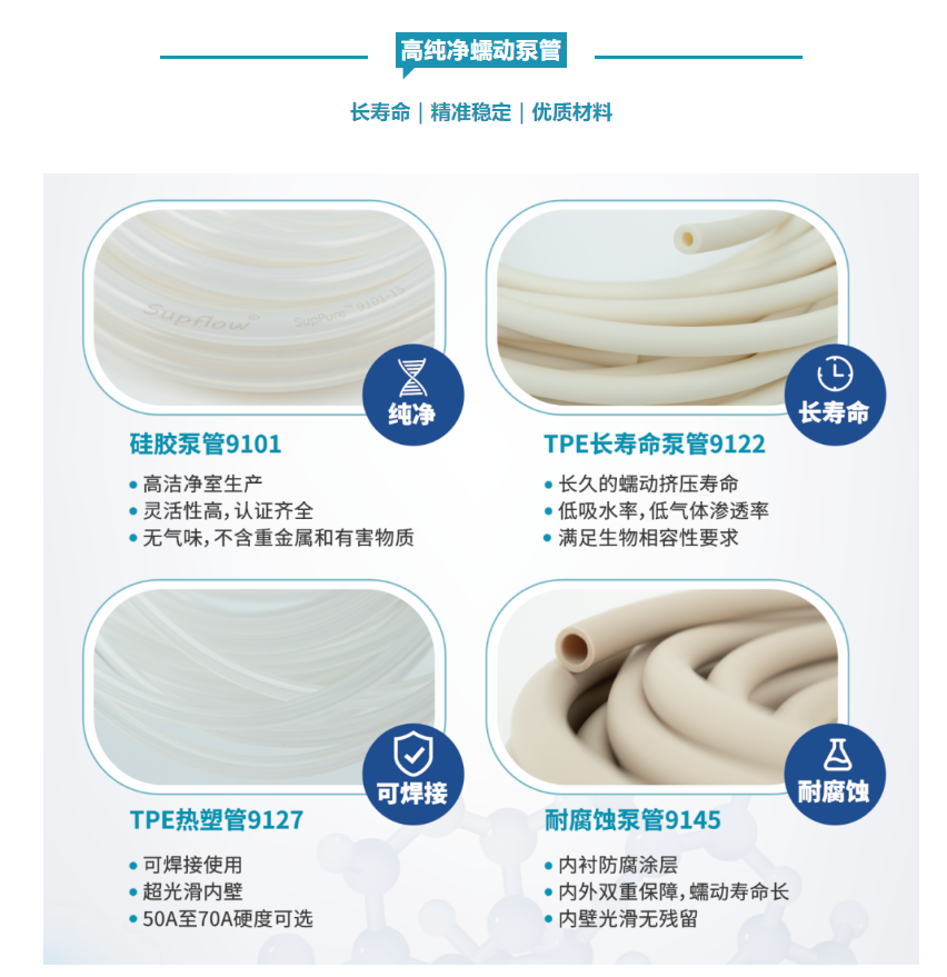 未藍(lán)可提供高純度和高可靠性的生物制藥高品質(zhì)泵管,且材質(zhì)選擇范圍廣,滿足不同藥液、溶劑的介質(zhì)傳輸。