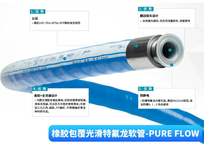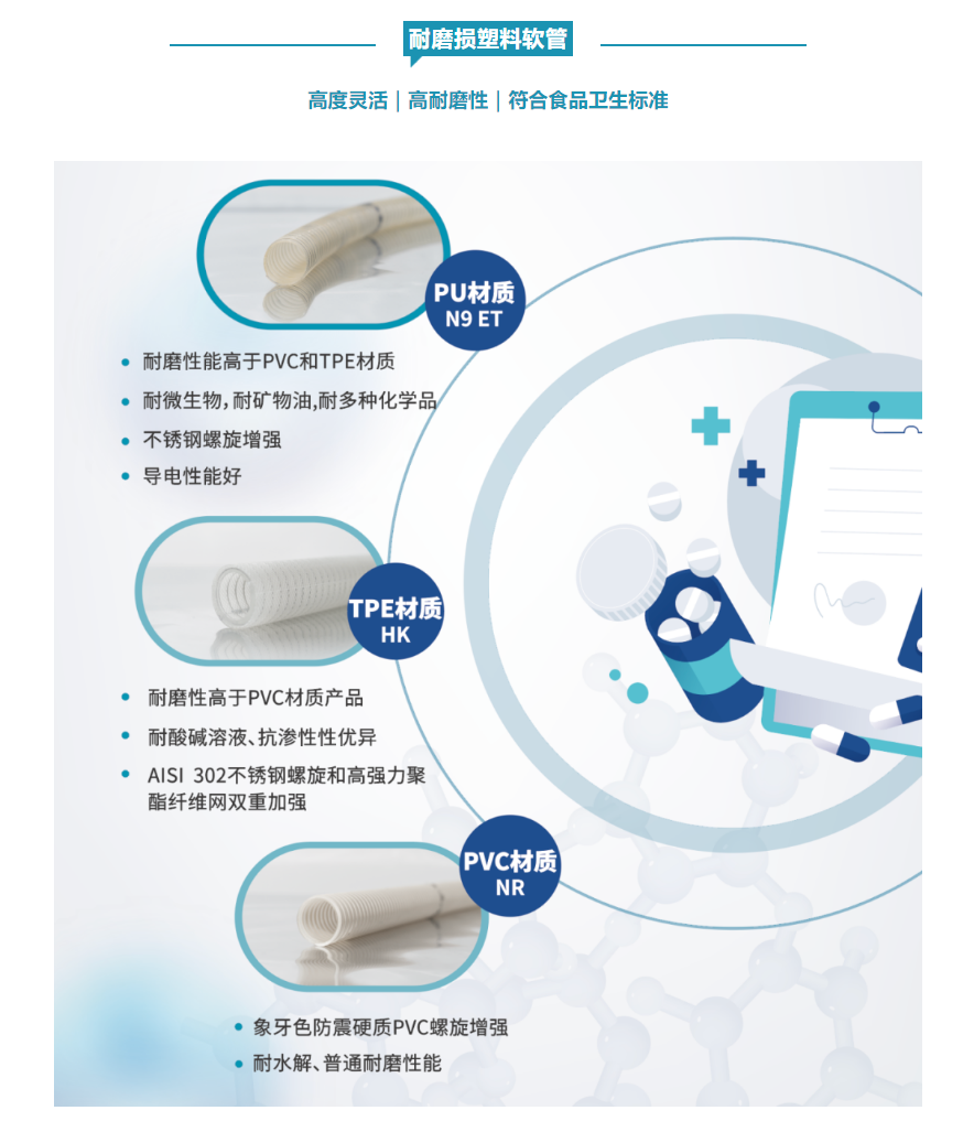 針對制藥行業(yè)粉體傳輸?shù)奶厥庑裕此{(lán)精選耐磨損可導(dǎo)靜電、易清洗材質(zhì)的塑料軟管(PVC PU TPE)且均經(jīng)檢測符合食品衛(wèi)生標(biāo)準(zhǔn),可有效保證藥粉傳輸過程中的純凈度和安全性。