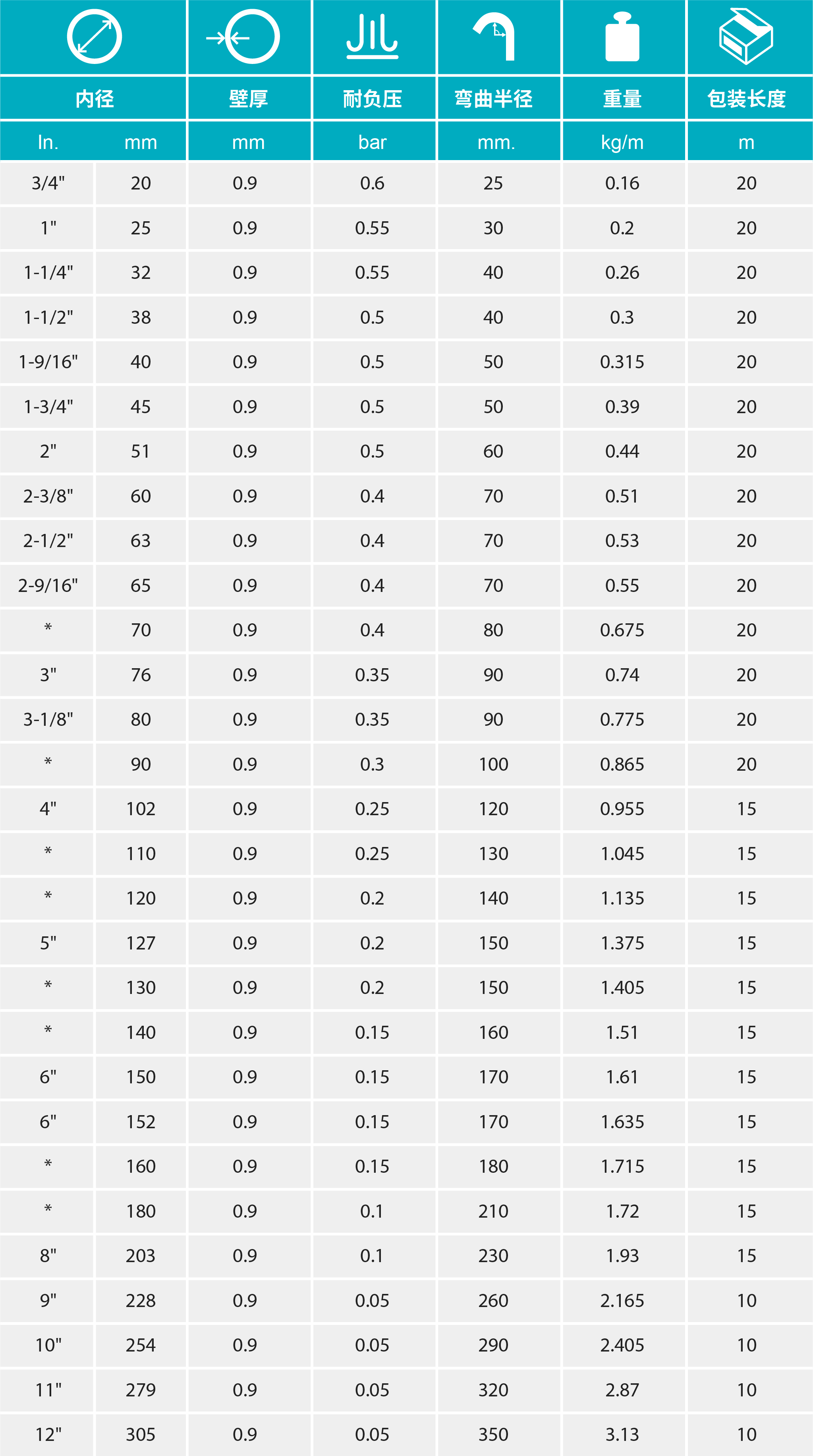 - 不同規(guī)格產(chǎn)品的壁厚相同, 均為0.9毫米