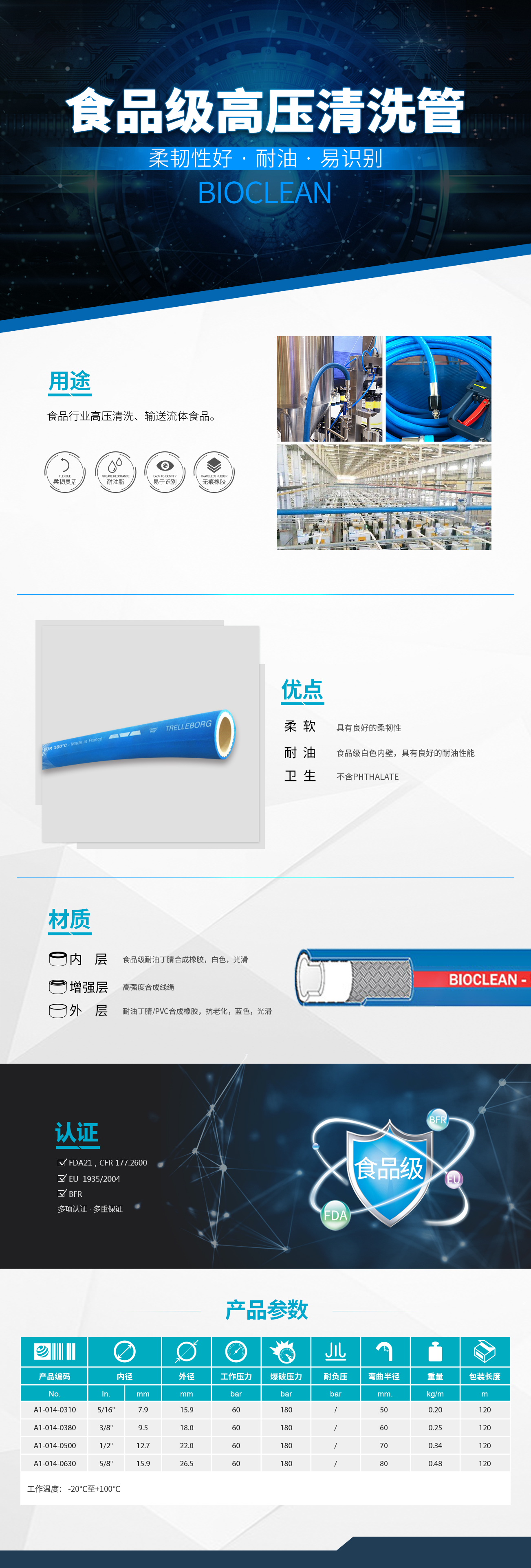• 適用于食品行業(yè)高壓清洗工作場(chǎng)合,也可用于輸送流體食品介質(zhì)。