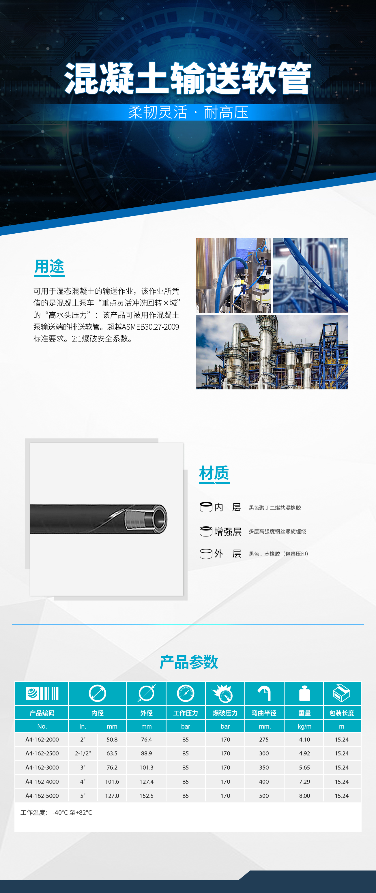 本品可用于濕態(tài)混凝土的輸送作業(yè),該作業(yè)所憑借的是混凝土泵車“重點(diǎn)靈活回轉(zhuǎn)區(qū)域”的“高水頭壓力”;該產(chǎn)品可被用作混凝土泵輸送端的排送軟管。