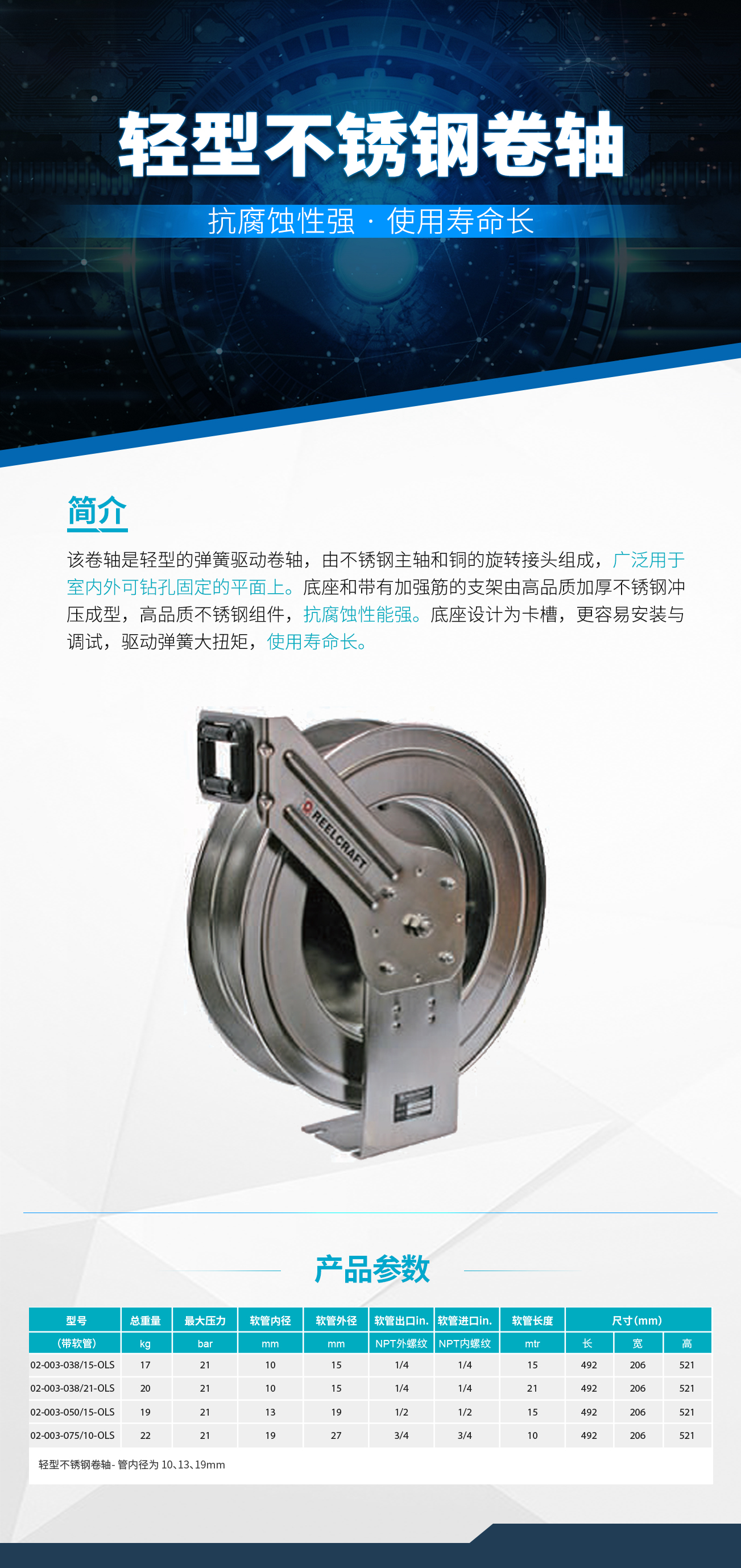 • 不銹鋼卷軸全部采用美國304級優(yōu)質(zhì)不 銹鋼制造而成,使用銳技抗腐蝕不銹鋼卷軸,將會延長用于輸送化學流體或用來清洗的軟管的壽命。通過合理的存放 不使用的軟管,可以減少由于軟管存放雜亂無序引起的絆倒事故,同時改善工作環(huán)境。不銹鋼卷軸使用范圍廣泛, 例如:食品生產(chǎn)、清洗,化學物質(zhì)的輸送,以及工業(yè)溶劑處理。同時不銹鋼卷軸還可應用在沿海和海上對抗腐蝕有苛刻要求的環(huán)境中。旋轉(zhuǎn)接頭使用 Viton“O”型圈。