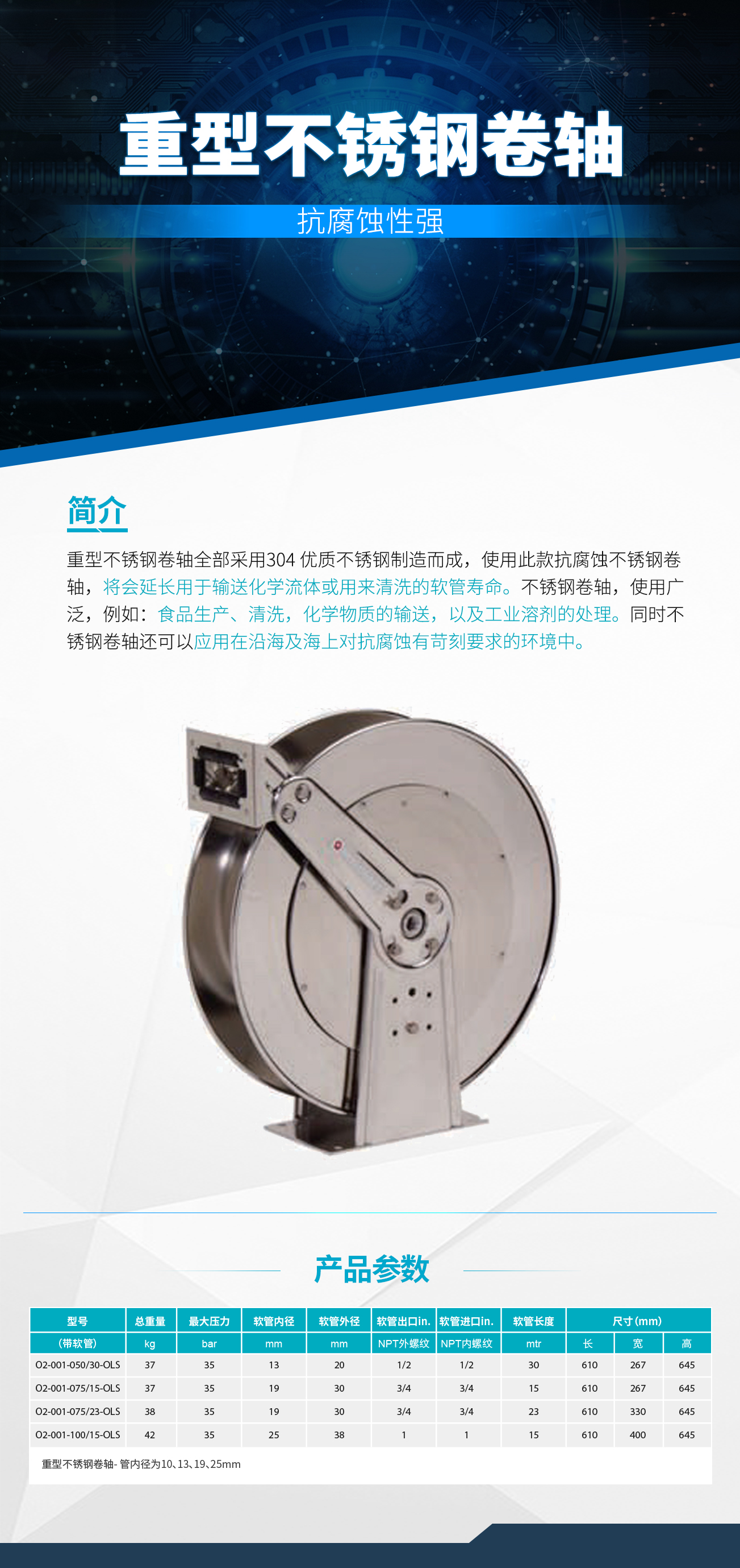 不銹鋼卷軸全部采用美國304級優(yōu)質不 銹鋼制造而成,使用銳技抗腐蝕不銹鋼卷軸,將會延長用于輸送化學流體或用來清洗的軟管的壽命。通過合理的存放 不使用的軟管,可以減少由于軟管存放雜亂無序引起的絆倒事故,同時改善工作環(huán)境。不銹鋼卷軸使用范圍廣泛, 例如:食品生產、清洗,化學物質的輸送,以及工業(yè)溶劑處理。同時不銹鋼卷軸還可應用在沿海和海上對抗腐蝕有苛刻要求的環(huán)境中。旋轉接頭使用 Viton“O”型圈。