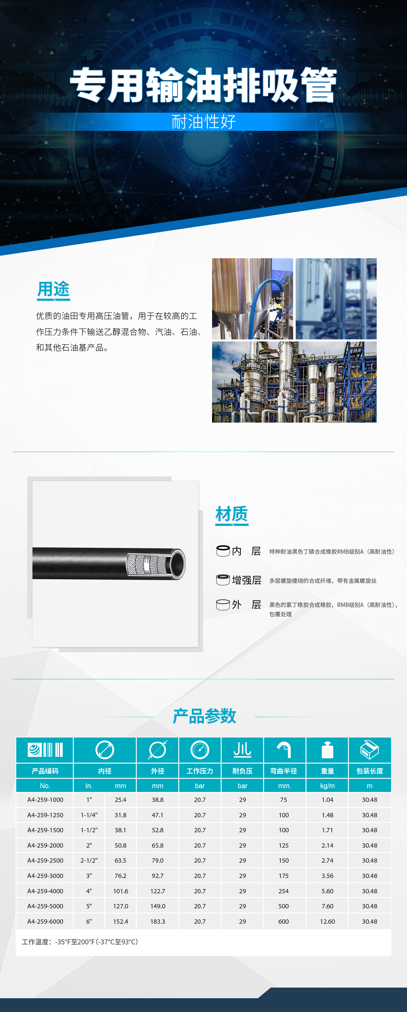 • 本膠管產(chǎn)品,可用于汽油、石油、乙醇混合物,以及其他的芳烴含量可達(dá)50%的石油基產(chǎn)品的罐車和廠內(nèi)輸送作業(yè)。本品的設(shè)計(jì)上可用于壓力、自重和全面的抽吸作業(yè)。