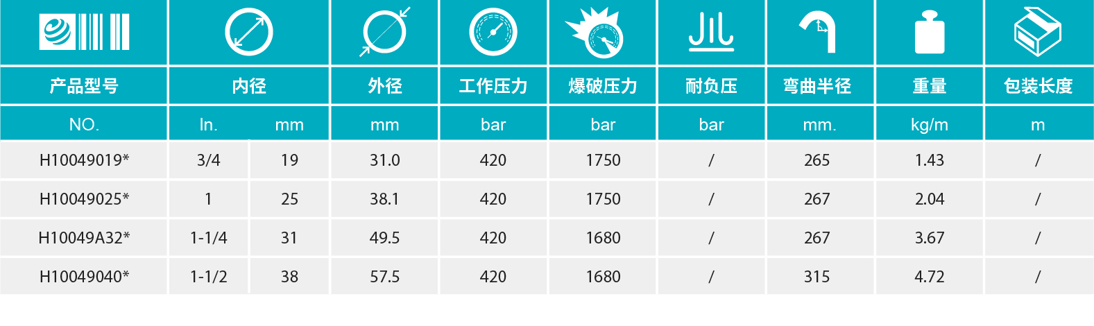 - 【增強(qiáng)層】:4層高抗拉鋼絲纏繞(DN19-25) 6層高抗拉鋼絲纏繞(DN31-38)
