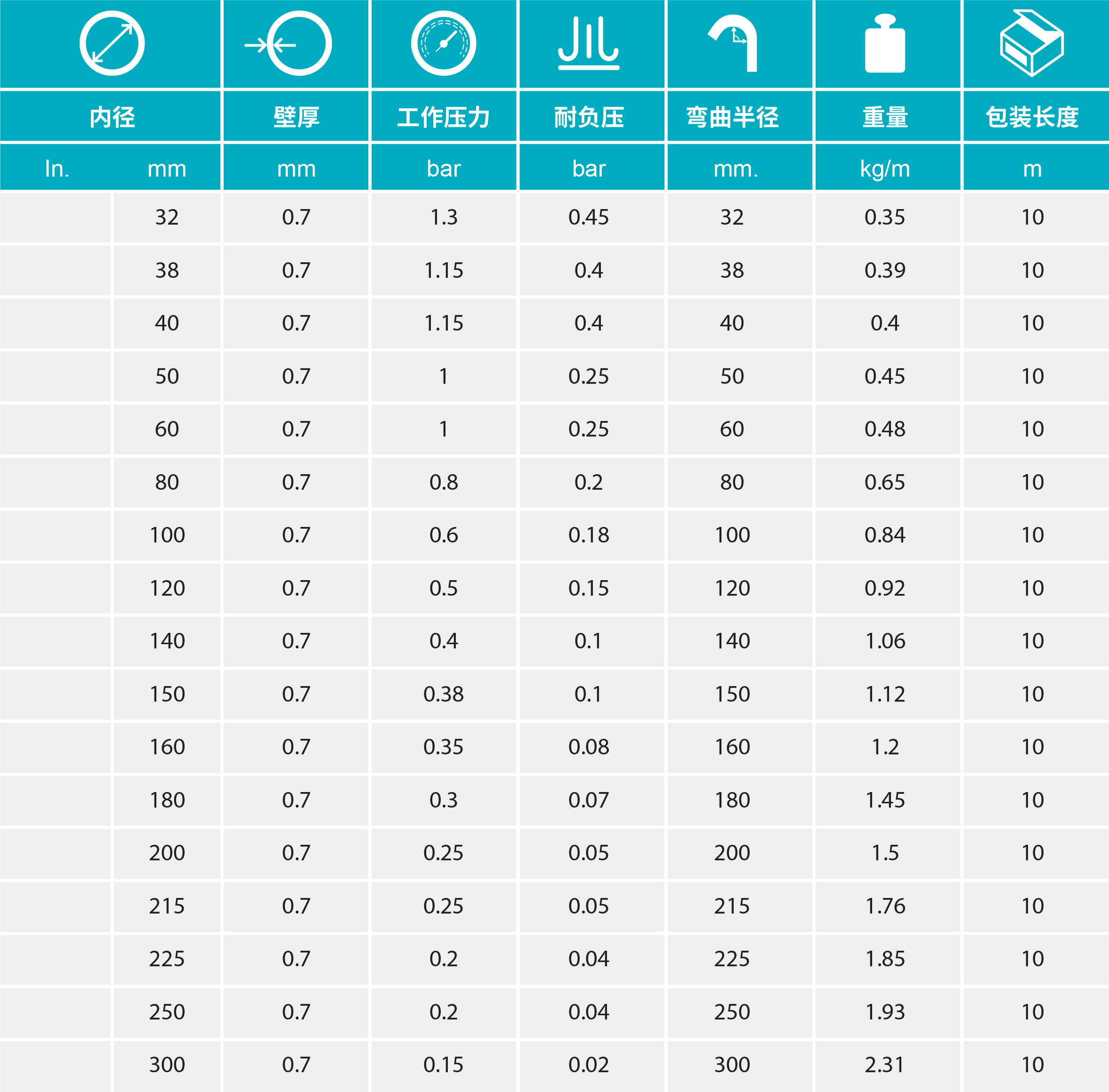 • 內(nèi)壁非常平滑以保證物料在管內(nèi)流動順暢,具有良好的柔韌性