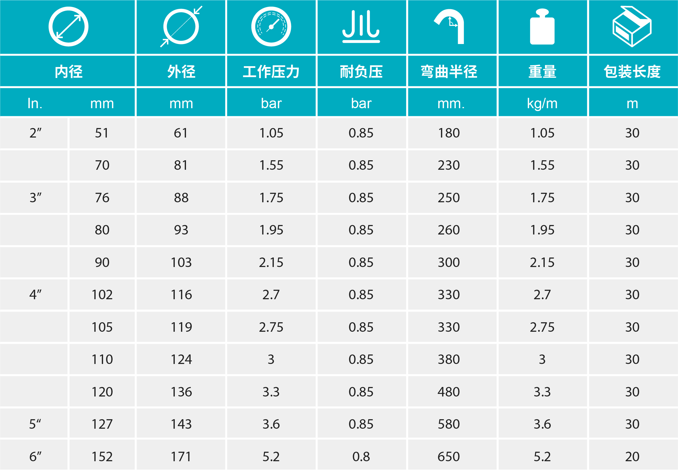 • 用于低溫度的中型排吸工況,可用于農(nóng)業(yè)灌溉、供水、罐車等,耐低溫、柔韌性好