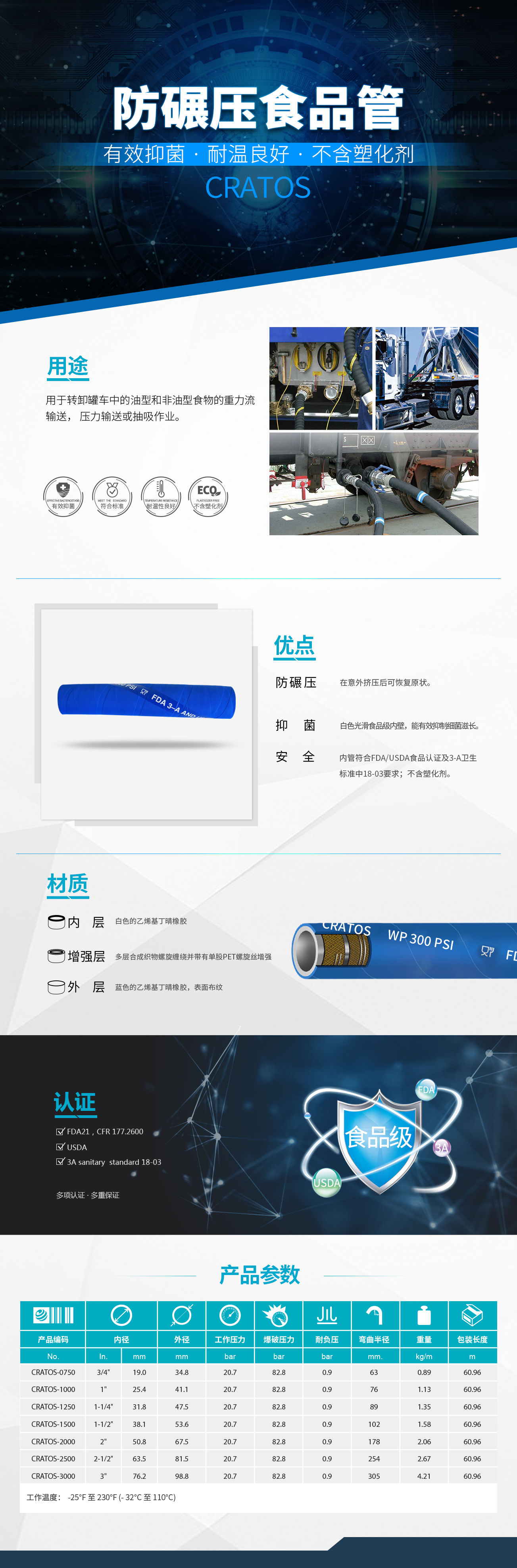 - 柔軟的膠管,具有特殊增強(qiáng)層材料,在意外擠壓后可恢復(fù)原狀,常用于轉(zhuǎn)卸罐車中的油型和非油型食物的重力流輸送,壓力輸送或抽吸作業(yè)。