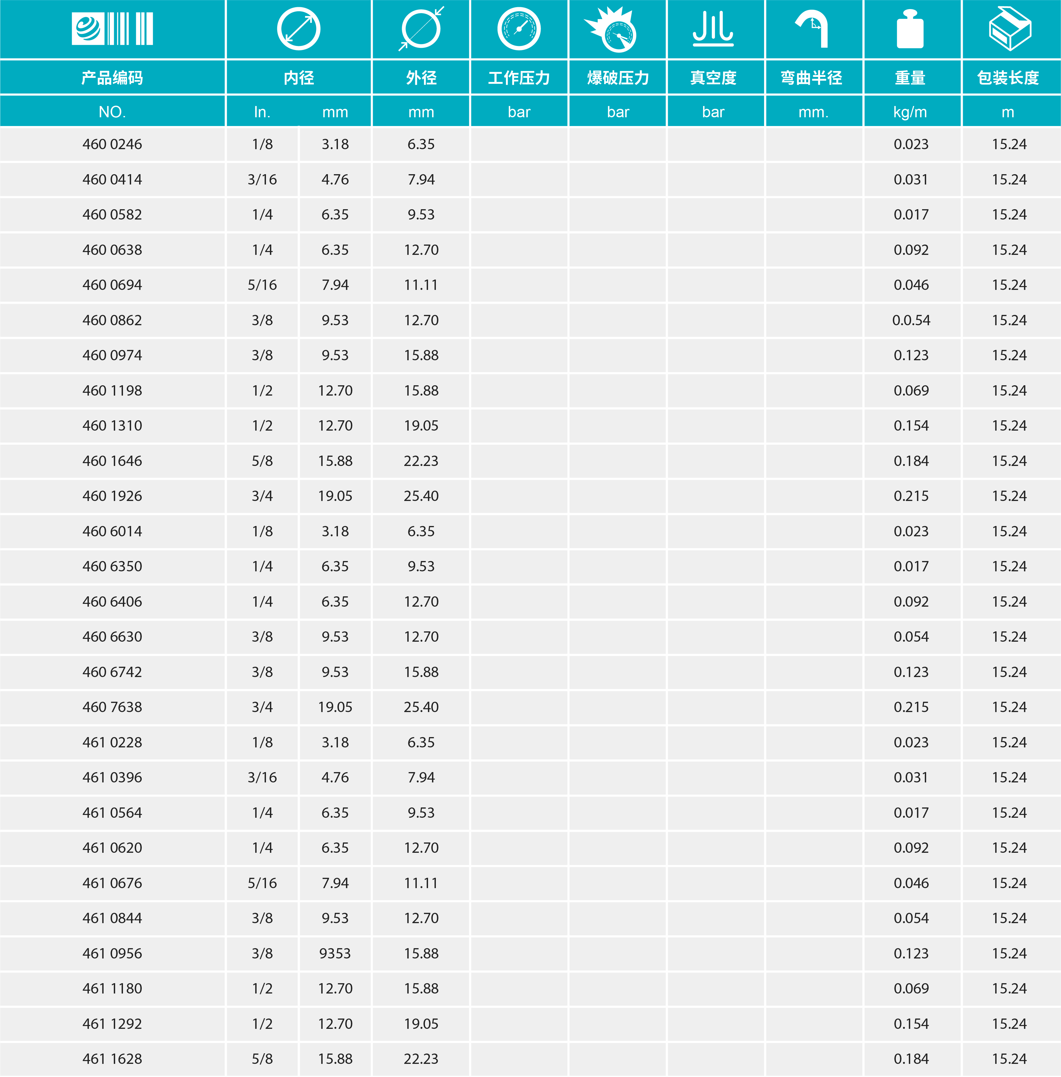 - 硬度 (77℉情況): 自然色食品管:64A;自然色食品管:80A;黑色工業(yè)軟管:64A