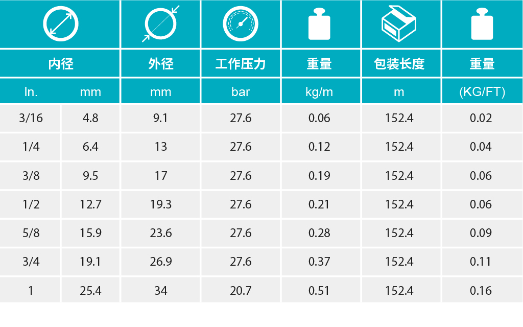 • 在300 psi的工作壓力條件下,與push-on配件配合使用.用于低壓液壓、啟動輸送系統(tǒng),如機器人系統(tǒng)、車間氣源系統(tǒng)、一般性工業(yè)作業(yè)、維護性作業(yè)和汽車裝配等方面的用途。本品具有絕緣性,在1000伏直流電的條件下,膠管上每英寸長度的最小電阻大于1兆歐姆。