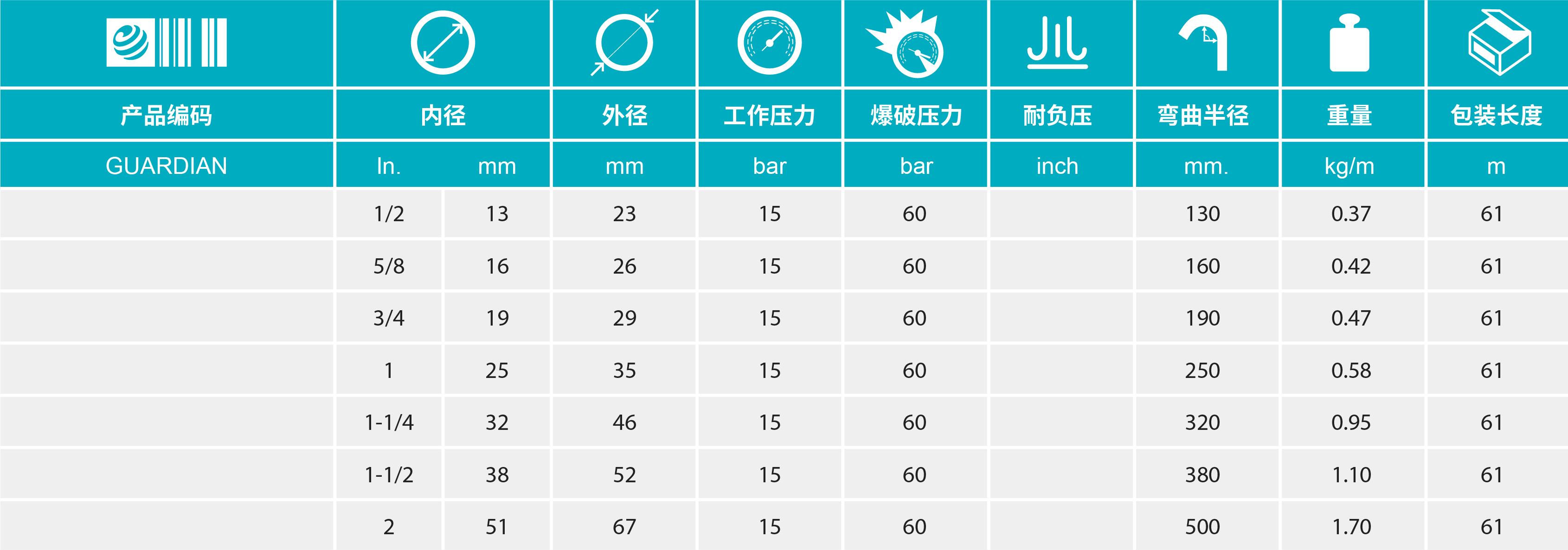 內(nèi)膠層:黑色導(dǎo)電EPDM合成橡膠 增強層:多層高強度合成纖維螺旋 外膠層:黑色、導(dǎo)電EPDM合成橡膠;具有耐高溫、耐磨、耐候和耐臭氧性能 工作溫度:-40°C到+165°C 爆破壓力:最小值60bar 安全系數(shù):熱水3:1,蒸汽10:1 標(biāo)準(zhǔn)長度:61m