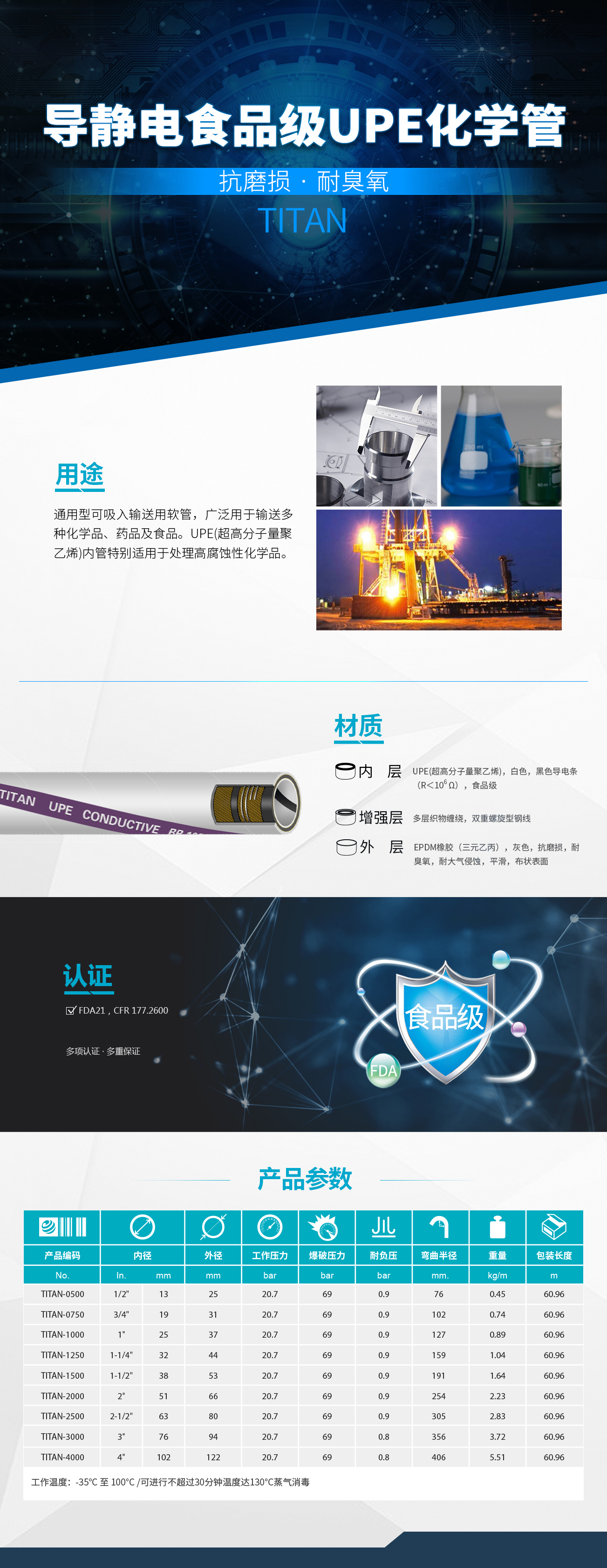 - 通用性可吸入輸送用軟管,廣泛應(yīng)用輸送多種化學(xué)品、食品及藥品。內(nèi)層導(dǎo)電UPE(超高分子量聚乙烯)特別適用于輸送高腐蝕性化學(xué)品和防靜電需求應(yīng)用場(chǎng)景。