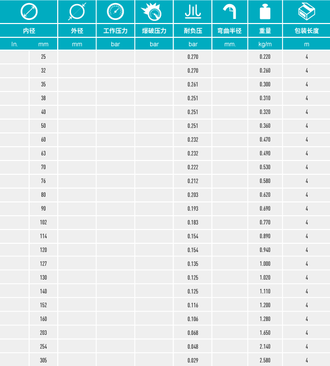• 雙層玻璃纖維織物覆硅膠涂層,內(nèi)嵌鍍銅鋼絲螺旋增強(qiáng)