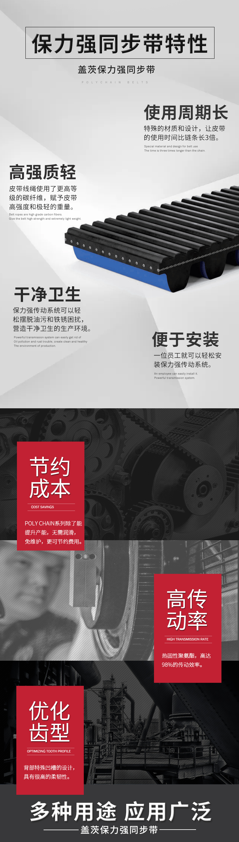 - 適用于工業(yè)市場(chǎng)應(yīng)用,特別適合于替換鏈條。主要用于高扭矩的傳動(dòng)系統(tǒng)中。