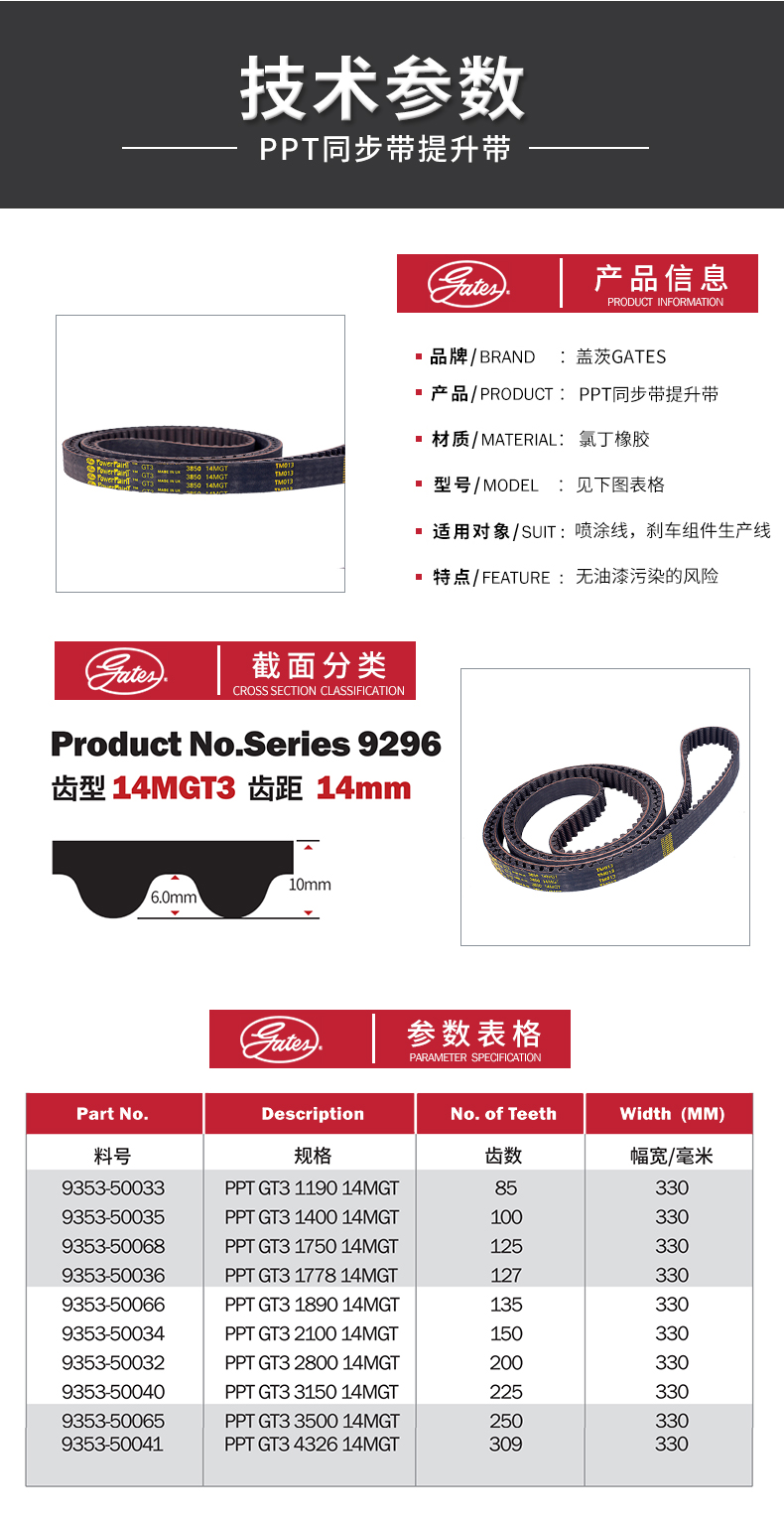 - 蓋茨GATES同步帶提升帶PowerPaint橡膠傳動帶PPT GT3 3500 14MGT