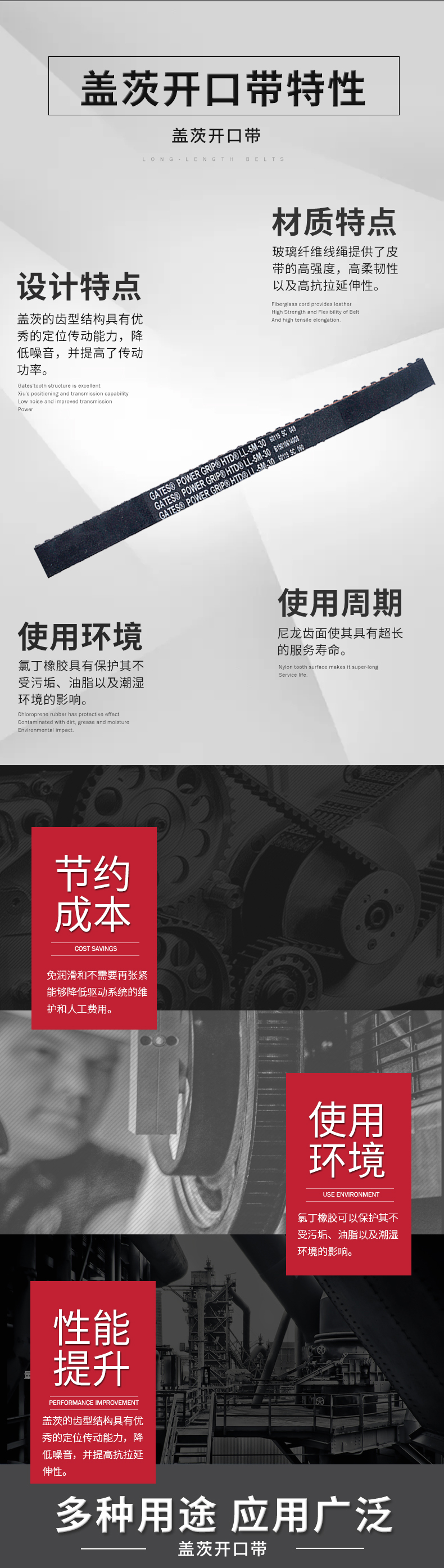 - 蓋茨的齒型結(jié)構(gòu)具有較好的定位傳動(dòng)能力,能夠提高其傳動(dòng)功率,降低運(yùn)行噪音。