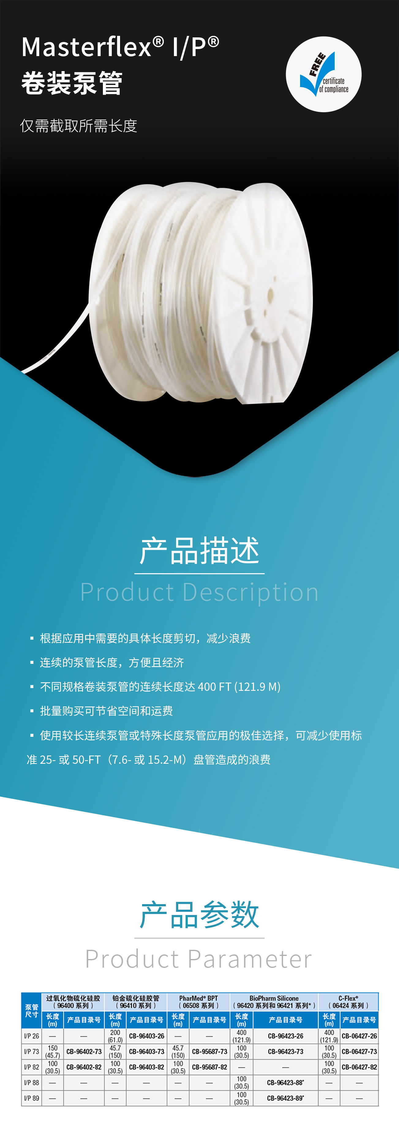 使用較長連續(xù)泵管或特殊長度泵管應(yīng)用的較好選擇,可減少使用標(biāo)準(zhǔn) 25- 或 50-ft(7.6- 或 15.2-m)盤管造成的浪費
