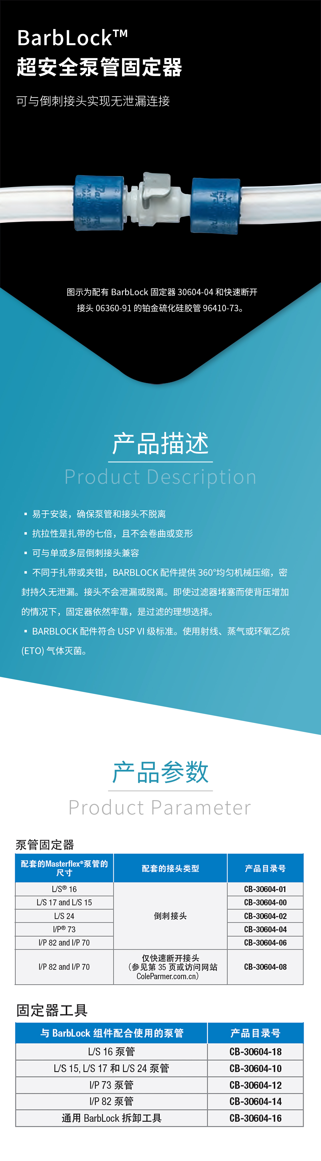 BarbLock 配件符合 USP VI 級標(biāo)準(zhǔn)。使用射線、蒸氣或環(huán)氧乙烷 (EtO) 氣體滅菌。