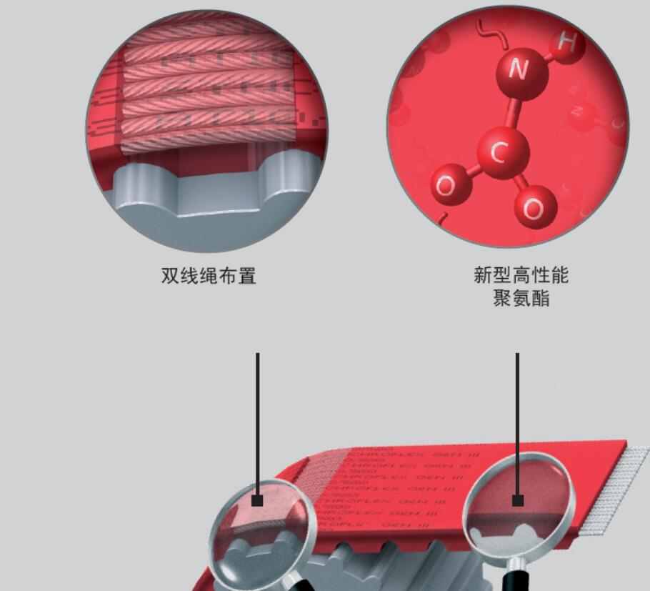 - 同步帶由耐磨聚氨酯和高強(qiáng)度鋼絲抗拉層制成,這兩種優(yōu)質(zhì)材料使得聚氨酯同步帶延展率極低, 且高度耐用。