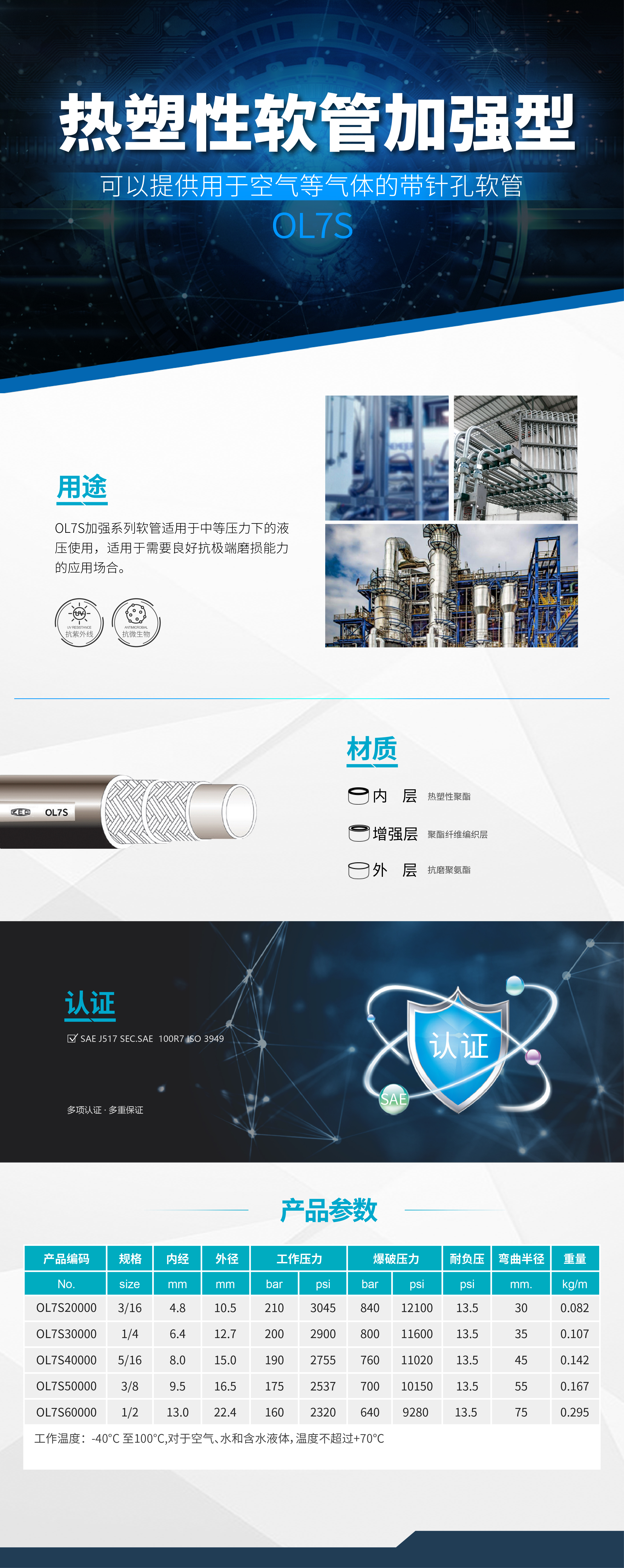 - OL7S 加強(qiáng)系列軟管適用于中等壓力下的液壓使用,適用于需要良好抗磨損能力的應(yīng)用場(chǎng)合。