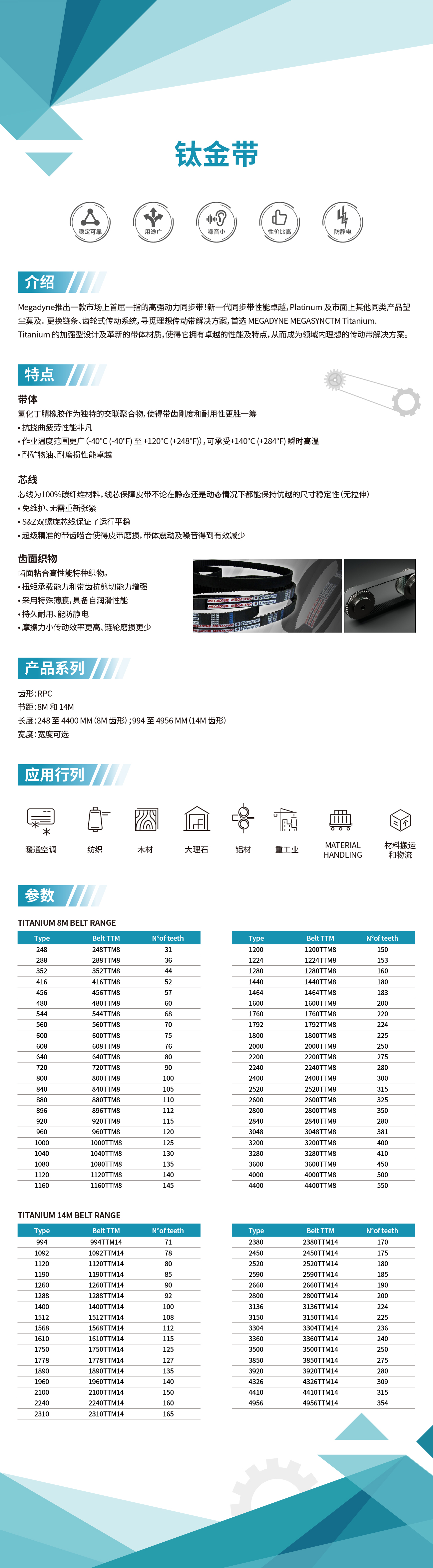 Megadyne推出一款市場上首屈一指的高強動力同步帶!新一代同步帶性能卓越,Platinum 及市面上其他同類產品望塵莫及。 更換鏈條、齒輪式傳動系統(tǒng),尋覓理想傳動帶解決方案。