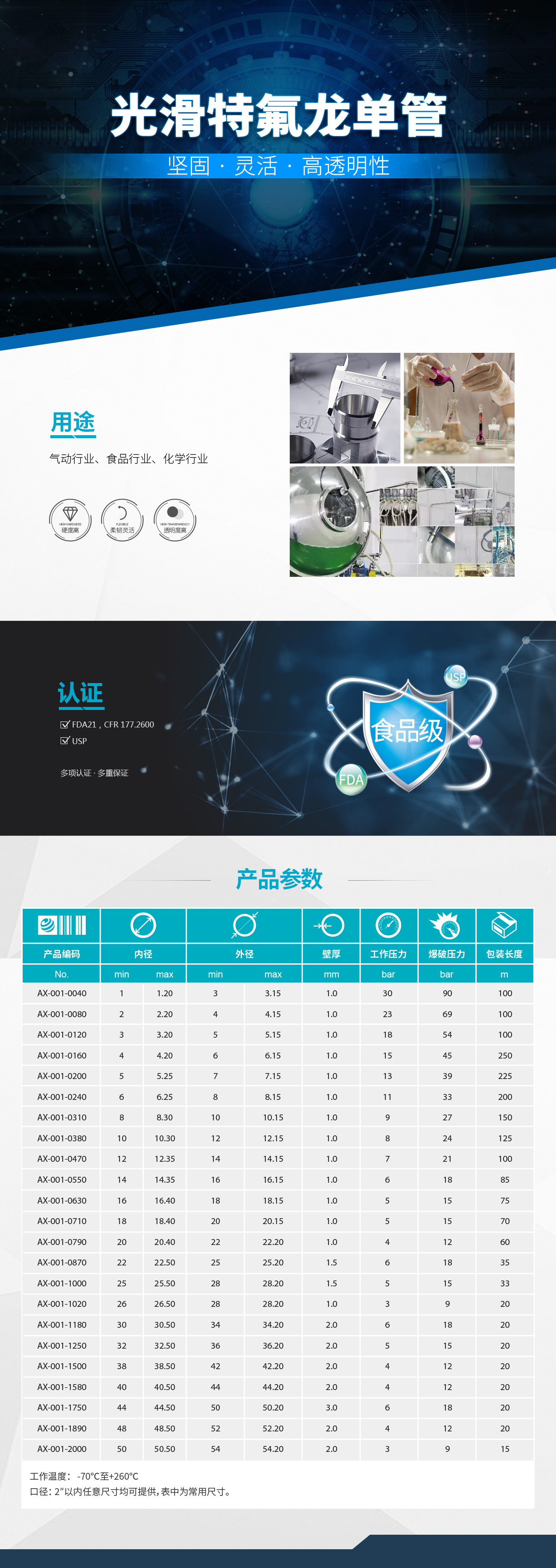 PTFE單管,堅(jiān)固、靈活及高透明性使得該軟管成為了眾多行業(yè)的優(yōu)先選擇,如:氣動行業(yè),食品行業(yè),化學(xué)行業(yè)等。