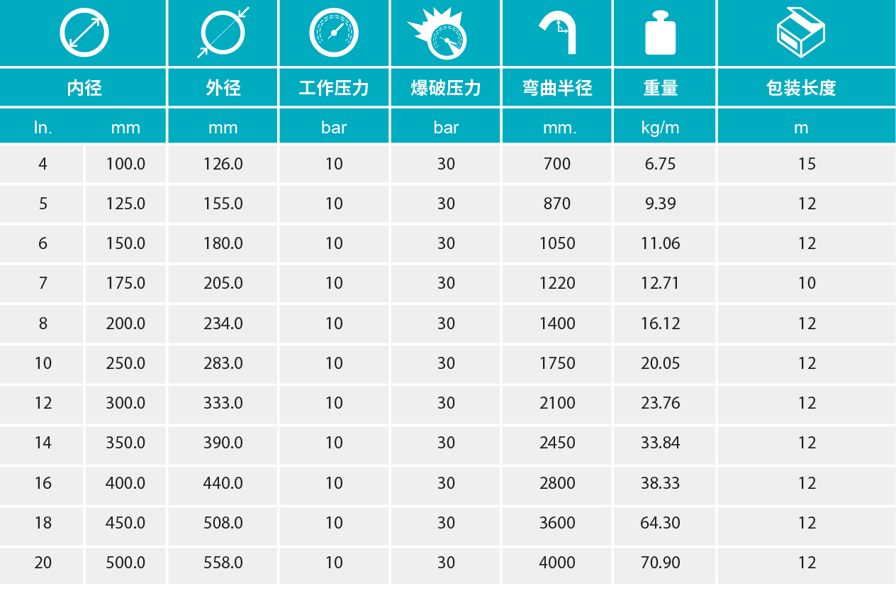 - 【增強(qiáng)層】ID≤400mm雙層鋼絲纏繞,ID≥450mm 四層鋼絲纏繞