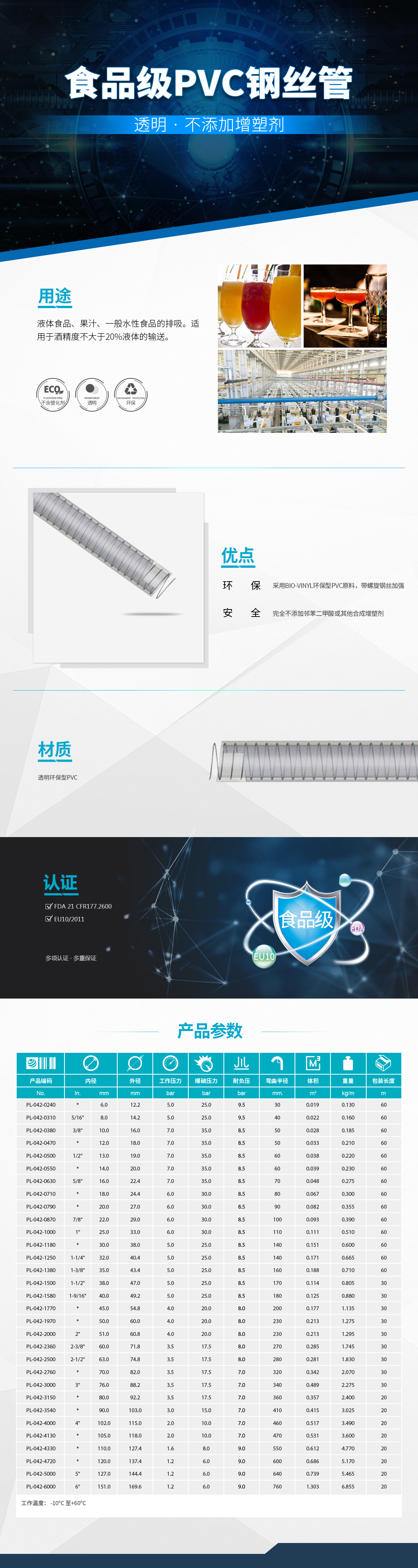 • 輸送軟管采用革命性的BIO-VINYL環(huán)保型PVC原料,帶螺旋鋼絲和高強度聚酯纖