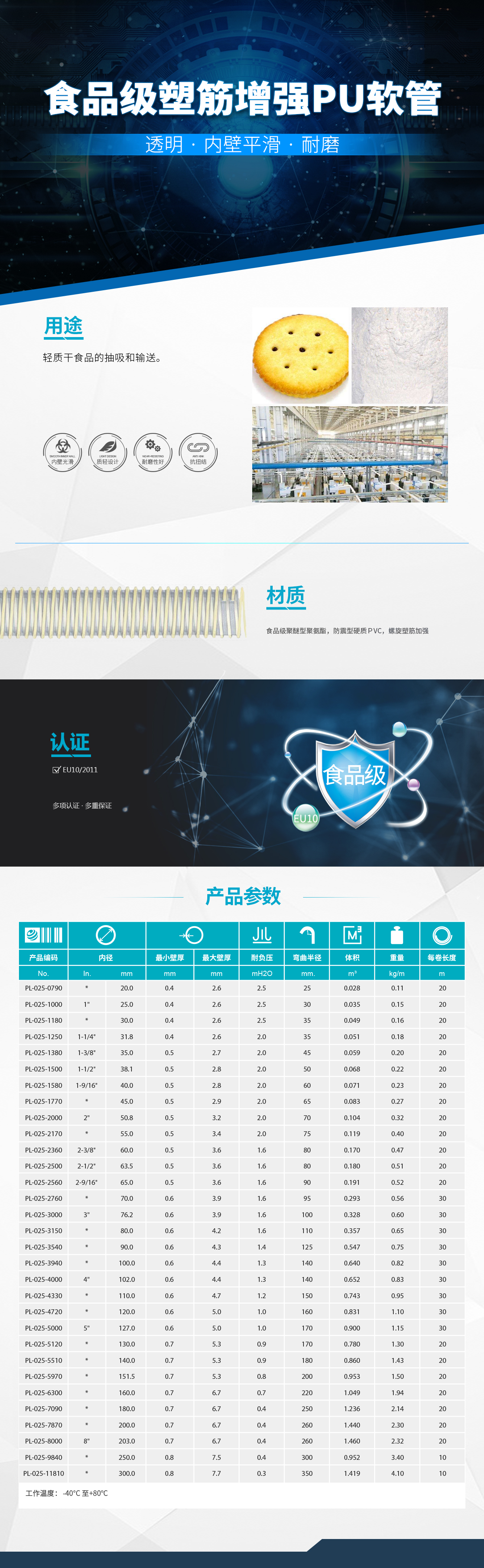 - 食品級聚醚型聚氨酯材質(zhì)管壁,帶防震型硬質(zhì)PVC螺旋塑筋加強(qiáng),內(nèi)壁平滑,外表面螺旋狀凸起