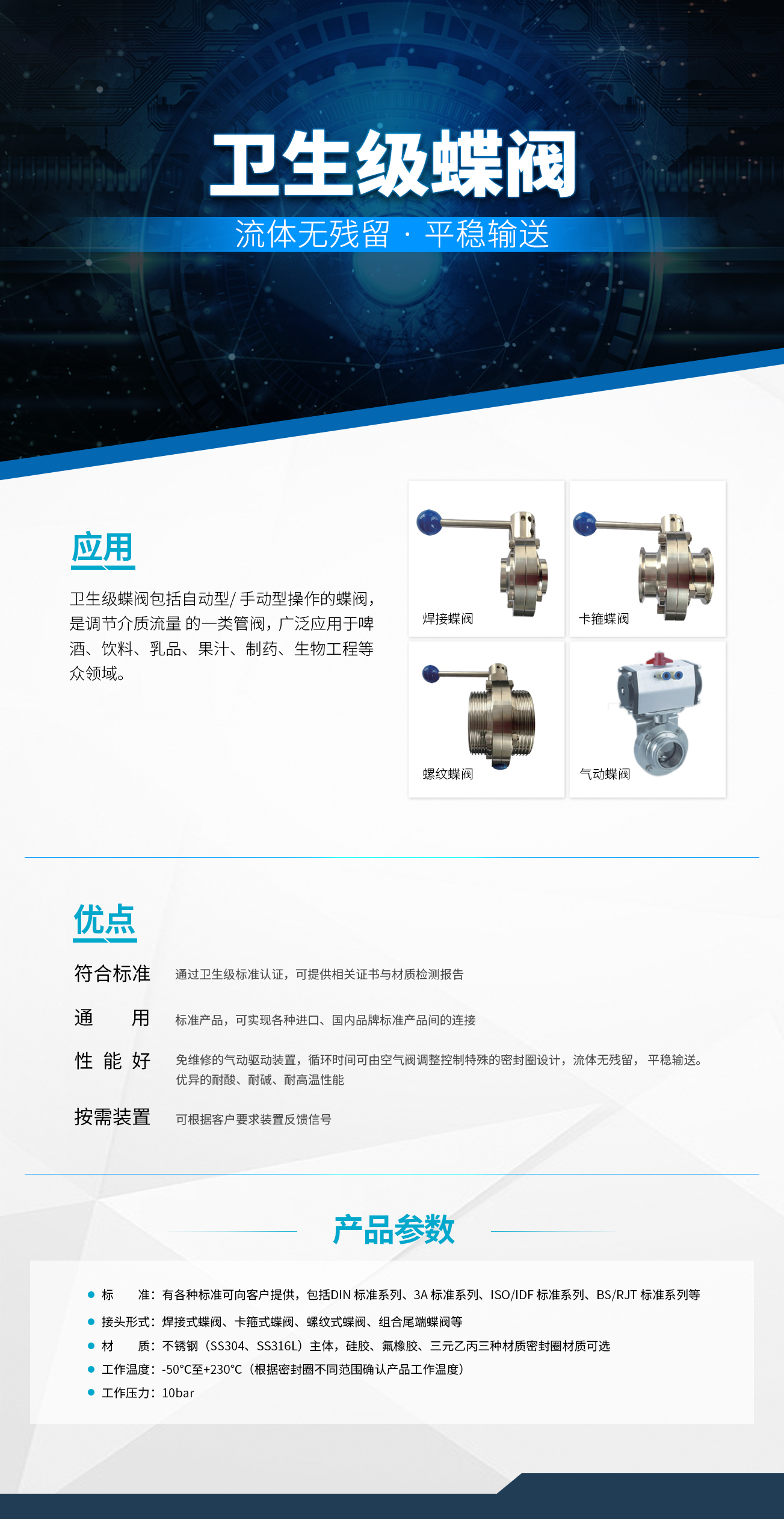 - 衛(wèi)生級(jí)蝶閥包括自動(dòng)型/手動(dòng)型操作的蝶閥,是調(diào)節(jié)介質(zhì)流量的一類管閥,廣泛應(yīng)用于啤酒、飲料、乳品、果汁、制藥、生物工程等眾領(lǐng)域。