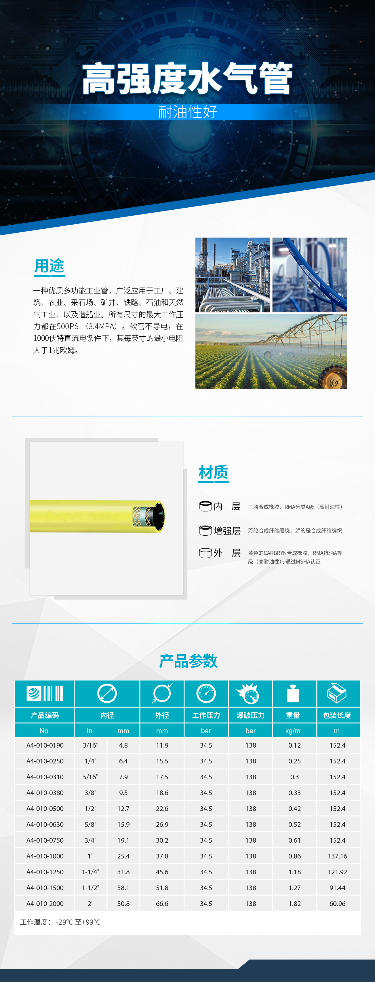 - 一種優(yōu)質(zhì)多功能工業(yè)管,廣泛應(yīng)用于工廠、建筑、農(nóng)業(yè)、采石場、礦井、鐵路、石油和天然氣工業(yè)、以及造船業(yè)。所有尺寸的工作壓力都在500psi(3.4Mpa)。軟管不導(dǎo)電,在1000伏特直流電條件下,其每英寸的電阻大于1兆歐姆。