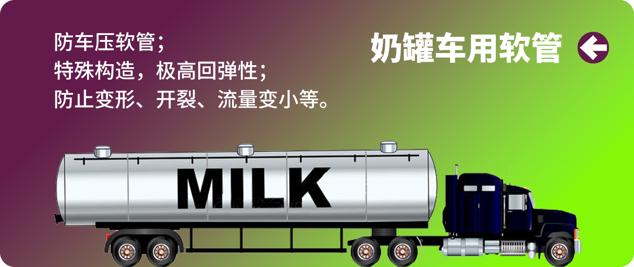 奶臺(tái)卸奶,衛(wèi)生級(jí)泵的前后端減震,儲(chǔ)罐轉(zhuǎn)運(yùn),車間清洗等,針對(duì)液態(tài)奶、冷飲、奶粉等產(chǎn)品加工過程,我們提供專業(yè)的軟管配套方案。