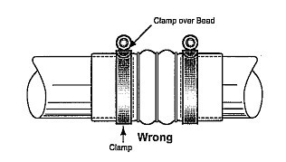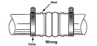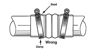 不正確的安裝方式 雖然喉箍也能被扭轉到一個合適的扭矩值,但膨脹節(jié) 在壓力的作用下運作,會使喉箍從軟管邊緣脫落,導致軟管泄露。 |
