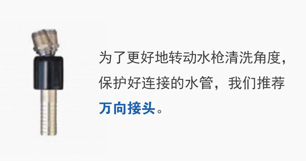 除此之外,針對設(shè)備外部及工作場合的清洗,比如在食品加工廠、糧油車間的糖分和油脂清洗,罐頭廠、屠宰廠、水產(chǎn)品市場的設(shè)備和地面清洗,周轉(zhuǎn)罐周轉(zhuǎn)槽的清洗,我們就需要另外的清洗方式。我們推薦的比較完善的方案是,蒸汽冷水混合器或者熱水冷水混合器+食品級清洗軟管+自動(dòng)收納的卷管器+清洗水槍,高效、節(jié)能,且規(guī)范。