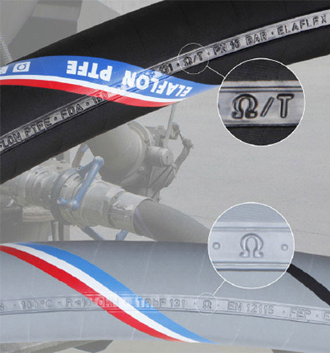 ● Ω =高安全性。由導(dǎo)電橡膠混合物制成。適用于正常使用,例如充裝對應(yīng)IIA的液體。如果軟管是部分用于危險區(qū)域-例如,防爆區(qū)域限制在接頭區(qū)域,此類軟管也可以被接受的。