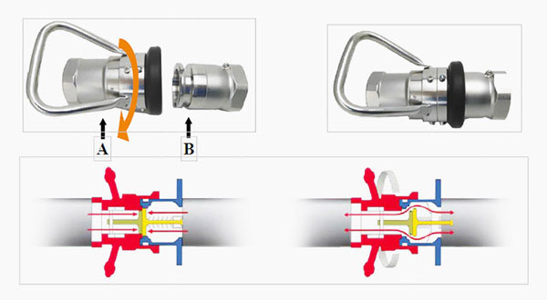 將母頭端(圖示 A)對(duì)準(zhǔn)公頭端(圖示 B)順時(shí)針旋轉(zhuǎn) 15°連接在一起,此時(shí),閥門(mén)還是關(guān)閉的。繼續(xù)順時(shí)針旋轉(zhuǎn) 90°才能打開(kāi)閥門(mén),產(chǎn)品開(kāi)始流通。關(guān)閉閥門(mén)和打開(kāi)接頭,采用以上相反的步驟。