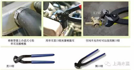 將軟管套上合適尺寸的單耳無極喉箍,套入連接裝置,并將喉箍放在正確的位置上,然后用單耳直口鉗夾緊喉箍耳