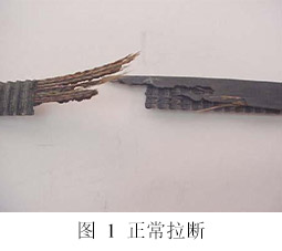 在皮帶運(yùn)轉(zhuǎn) 2 到 3 年后,當(dāng)其芯線(xiàn)達(dá)到疲勞壽命時(shí),皮帶失效是屬于正常情況。在經(jīng)過(guò)長(zhǎng)期運(yùn)轉(zhuǎn)后,皮帶由于芯線(xiàn)達(dá)到疲勞壽命而失效,這屬于理想的皮帶失效模式。圖 1  是一個(gè)參差不齊的45 度角的鋸齒狀斷裂皮帶,這是典型的皮帶芯線(xiàn)達(dá)到正常的疲勞壽命造成的。
