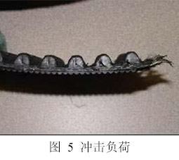 劇烈的沖擊負(fù)荷可以導(dǎo)致皮帶芯線(xiàn)以粗糙的不平均的形式斷裂,如圖4所示。皮帶齒部在帶輪中經(jīng)過(guò)即時(shí)沖擊負(fù)荷后可發(fā)展成齒根開(kāi)裂和/或齒部脫落。如果沖擊負(fù)荷只發(fā)生一次,或在皮帶固定的位置重復(fù)循環(huán),皮帶的其余齒部可能看起來(lái)還是正常的。圖5說(shuō)明了齒根開(kāi)裂如何在齒內(nèi)進(jìn)行擴(kuò)散。在齒根形成的裂縫有時(shí)會(huì)擴(kuò)散到齒尖。積聚過(guò)多裂縫時(shí)齒部就會(huì)剪切,就會(huì)只剩下齒的一部分。