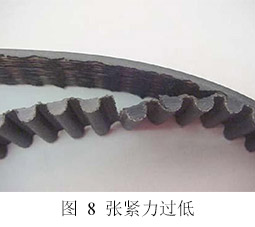 中度到高度負(fù)荷的傳動(dòng)系統(tǒng)中安裝張力過(guò)低也會(huì)導(dǎo)致皮帶過(guò)早的失效。通常張力過(guò)低導(dǎo)致的皮帶失效模式表現(xiàn)為跳齒。皮帶跳齒是指皮帶的齒爬出其對(duì)應(yīng)的輪槽,并且其根部不再承受負(fù)荷。傳動(dòng)負(fù)荷進(jìn)一步作用于皮帶側(cè)面使皮帶齒部彎曲,然后跳動(dòng)。齒部滾動(dòng)時(shí)可導(dǎo)致橡膠從齒根沿著芯線(xiàn)撕裂。隨著橡膠撕裂的擴(kuò)散,皮帶齒部開(kāi)始以條狀脫離皮帶,如圖8所示。由于過(guò)多跳齒導(dǎo)致的失效可能看起來(lái)好像橡膠與線(xiàn)繩的粘度不夠。然而,由于粘度不足所導(dǎo)致的失效,皮帶中外露芯線(xiàn)通常保持整潔,與滾齒失效模式不同。