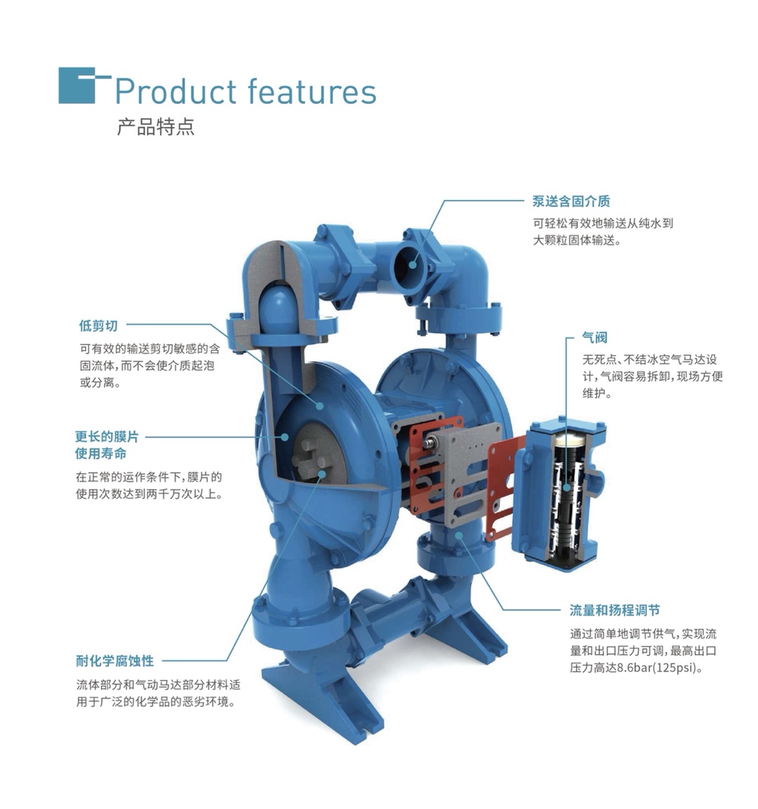 耐化學(xué)腐蝕性:流體部分和氣動馬達部分材料適用于廣泛的化學(xué)品的惡劣環(huán)境。