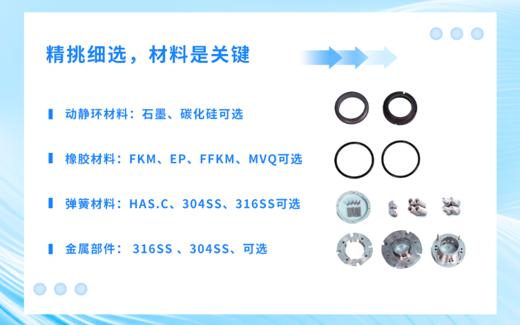 優(yōu)質(zhì)密封圈材料如碳化硅、石墨等,具有優(yōu)異的耐磨、耐腐蝕和抗高溫性;金屬部件選用高強(qiáng)度、耐腐蝕的合金鋼或不銹鋼;彈簧材料選用高彈性、耐腐蝕及抗高溫的不銹鋼。甄選品質(zhì),值得信賴。